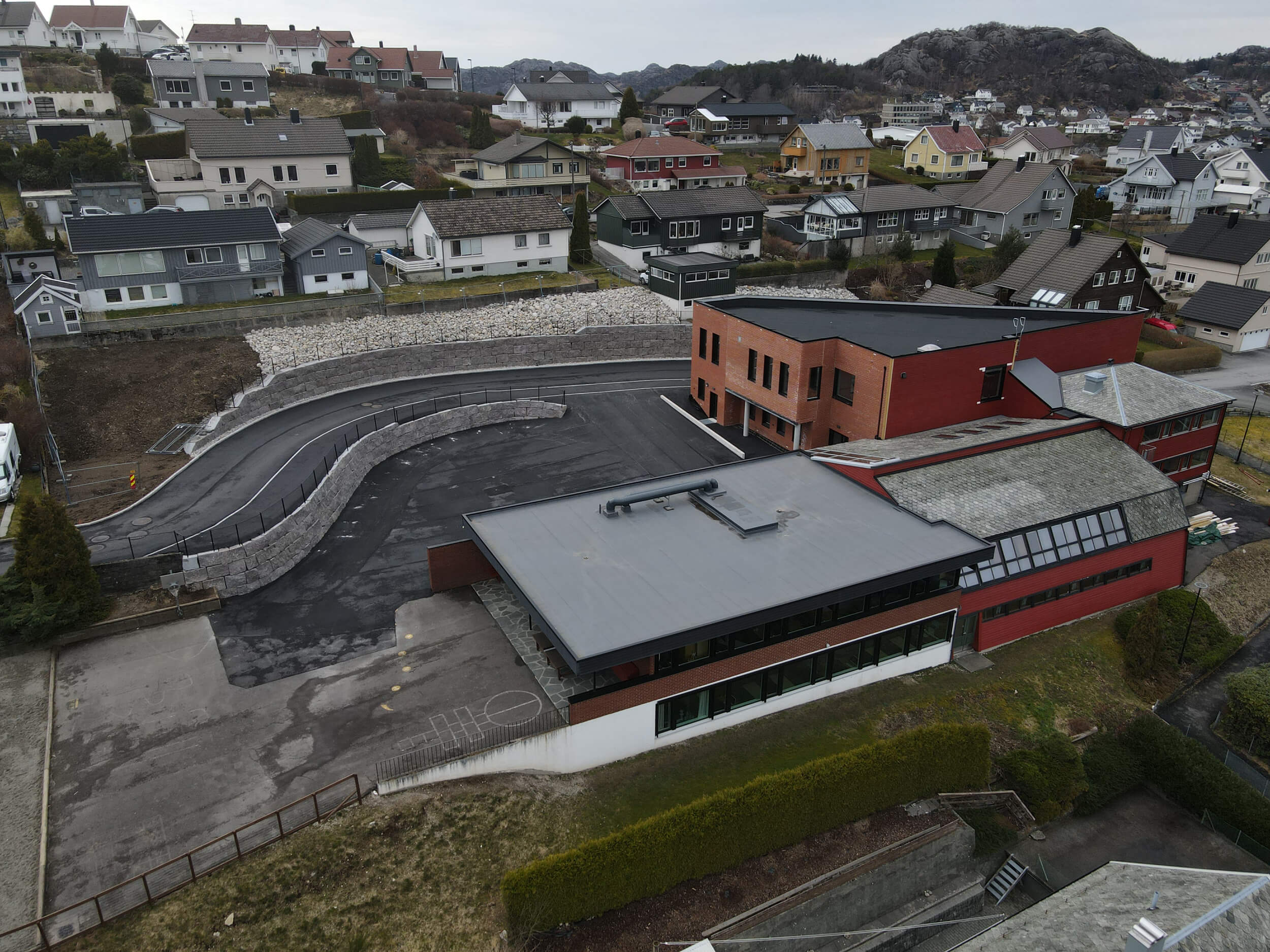 Skolen har vært lokalisert på Gamleveien siden 1933. Teglsteinsbygningen nede til venstre er eldste nåværende bygning, oppført i 1973. I 1996 ble det såkalte mellombygget oppført, og bandt sammen de to byggene som da utgjorde småskolen og ungdomsskolen. I 2023 ble vårt hittil største byggetrinn fullført. Den kommunale veien ble lagt om og gjorde det mulig å utvide både skolegården og bygningsmassen. Tilbygget Rektor Saglands Hus rommer blant annet kantine og skolekjøkken, grupperom og kontorer.